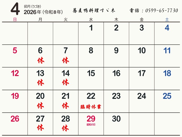 As usual, please check this updated version of our opening and closing days for April 2026 before your visit. Days marked with 「休」 in red indicate that we are closed on those days.