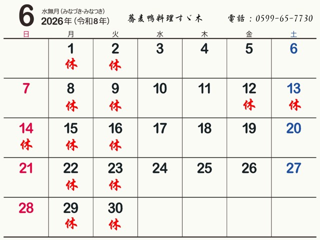 The fresh green leaves are now especially vivid to the eye. Although this may be a little early, we’d like to post our June business calendar. We hope it will be helpful when making your reservations or planning your visit.